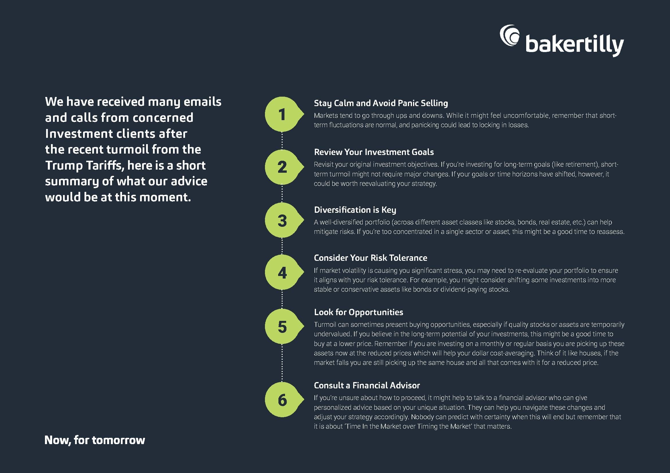 In light of the recent turmoil caused by the Trump tariffs, we have received numerous emails and calls from concerned investment clients. To address these concerns, we have compiled a short summary of our current advice for investors navigating these uncertain times. Below, you will find a list of tips to help you make informed decisions and safeguard your investments.